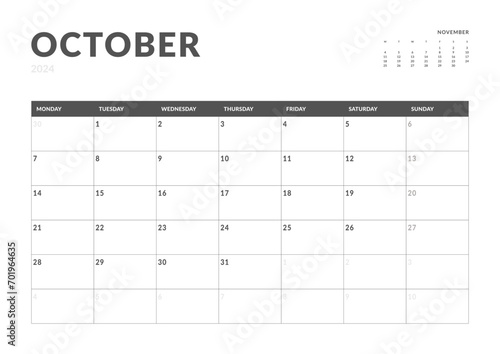 Monthly page Calendar Planner Templates of October 2024. Vector layout of simple calendar with week start Monday for print. Page for size A4 or 21x29.7 cm