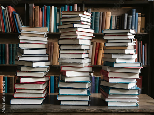 Montones de libros apilados sobre una mesa