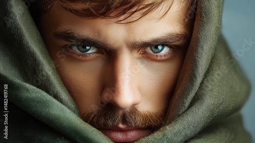Moody male close-up with deep gaze, mostly hidden by cloak or scarf