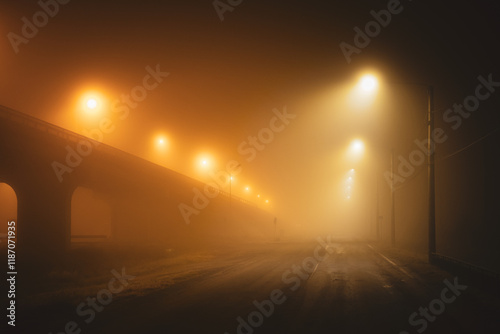 Moody orange street lights illuminating empty city road on a foggy winter night. No cars, no people