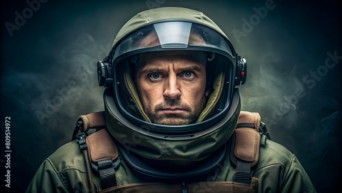 Moody Portrait of EOD Technician in Bomb Suit, Helmet Tilted, Exuding Determination and Professionalism.