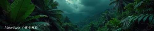 Moody Rainforest Lush Tropical Foliage Under a Dark Sky, Intense Shadows and Vibrant Greens, Perfect for Mysterious and Dramatic Designs