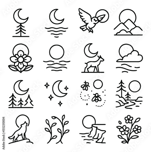 Moon and nature connections icons in minimalistic line art : crescent above tree, moon reflecting in water, owl flying past moon, moonlit mountain, full moon in flower bloom, mist under moon,