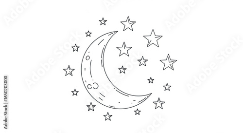 Moon and stars illustration, crescent moon with star shapes, night sky vector drawing, celestial line art