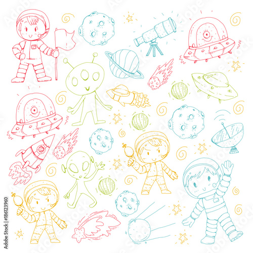 Moon surface. Kindergarten children play space exploration. Alien, ufo, spaceship. rocket. Children, boys and girls with moon, mars, saturn, jupiter