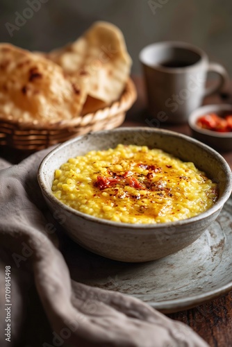 Moong dal khichdi with ghee drizzle and spicy pickle in rustic grey bowl