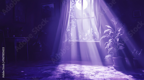 Moonlight streaming through window. intense beams of moonlight illuminate a darkened room, casting an ethereal glow on the dusty floor. Moonshade. Illustration