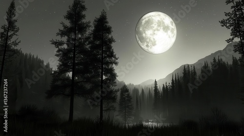 Moonlit Forest Landscape with Tall Trees and Reflections on a Calm Water Body at Night