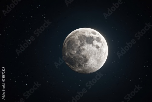 Moonlit night sky with detailed lunar surface, craters, and seas, surrounded by scattered stars for a tranquil atmosphere in dark, cool hues. Ideal for space enthusiasts and astronomy lovers