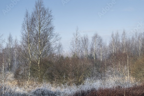 Moorland landscape in hoarfrost, Emsland, Lower Saxony, Germany