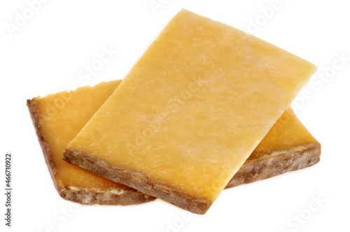 Morceaux de fromage de Cantal en gros plan sur fond blanc