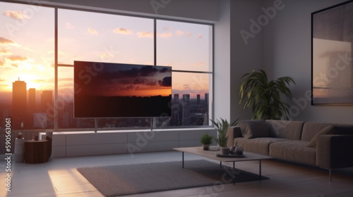 Morden living room interior with sofa, a coffee table, a lamp table, a pot of plant and one large window background with generative AI technology