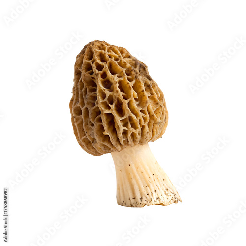 Morel mushroom, edible wild fungi with distinctive honeycomb texture and earthy color, isolated on a transparent background, high-quality PNG perfect for culinary designs, natural food illustrations