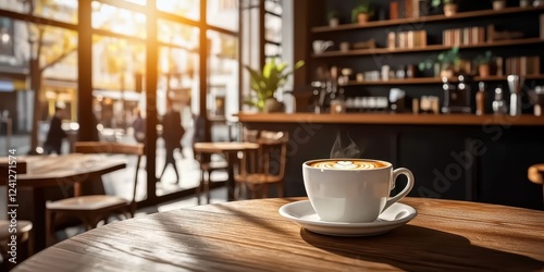 Morning coffee cafe and shop. Cozy coffee shop scene with a steaming cup on a wooden table by large windows.