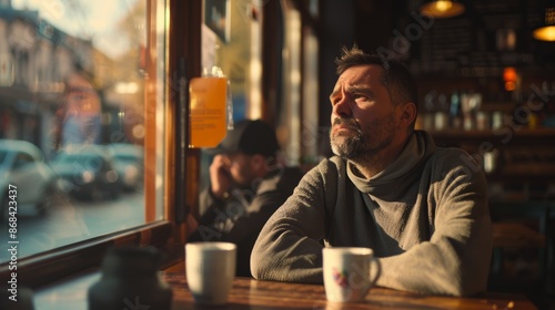 Morning Coffee Reflections: Man with a Weary Expression in a Sunlit Café Setting