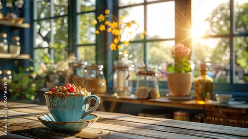 Morning Coffee Setting with Bright Sunlight and Cozy Atmosphere