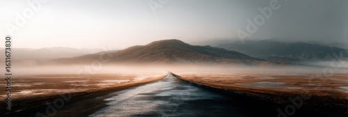 Morning Fog Blankets a Desolate Road Leading to Distant Mountains at Dawn During Early Hours