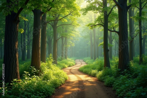 Morning Fog Walk. Sunlit green forest trees dirt path tranquil nature