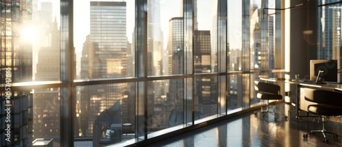 Morning light bathes an office interior, with glass walls framing a bustling city's skyline, capturing the essence of urban ambition and serenity.