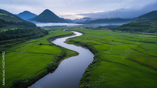 Morning light illuminates the vibrant green rice terraces alongside a meandering river. Mist hovers above the fields, creating a tranquil atmosphere in this idyllic rural setting