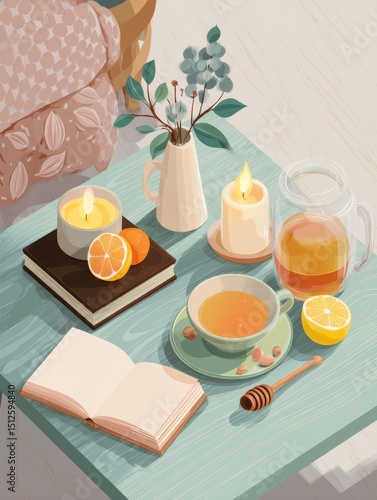 Morning Routine Illustration Showcasing Wellness With Tea, Candles, and a Cozy Reading Setup for Relaxation and Mindfulness