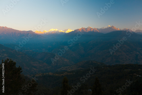 Morning Sun on Kangchenjunga Himalaya Mountain Peak with Valley Below