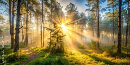 Morning sun shining through misty forest, creating a magical and ethereal atmosphere