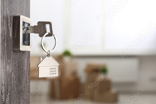 Mortgage and real estate. Open door with key and house shaped keychain against blurred background, space for text