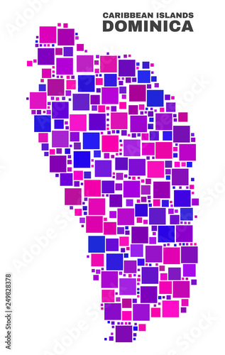 Mosaic Dominica Island map isolated on a white background. Vector geographic abstraction in pink and violet colors. Mosaic of Dominica Island map combined of random square elements.