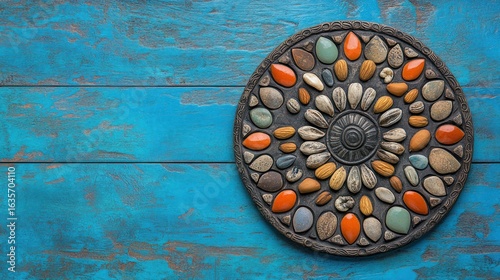 Mosaic tray decorated with stones nuts and seeds on wooden table