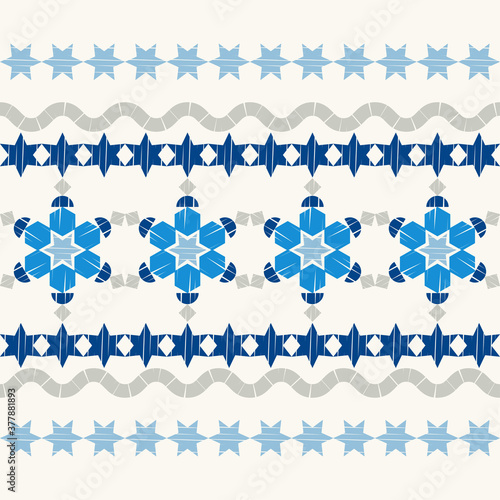 Mosaic with geometric shapes. Seamless pattern. Design with manual hatching. Textile. Ethnic boho ornament. Vector illustration for web design or print.