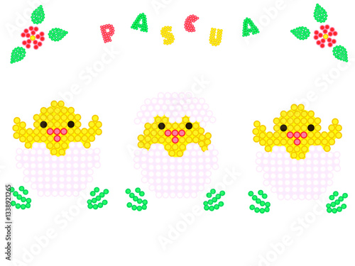 Mosaico con elementos de Pascua. Tres polluelos en cáscara de huevo.