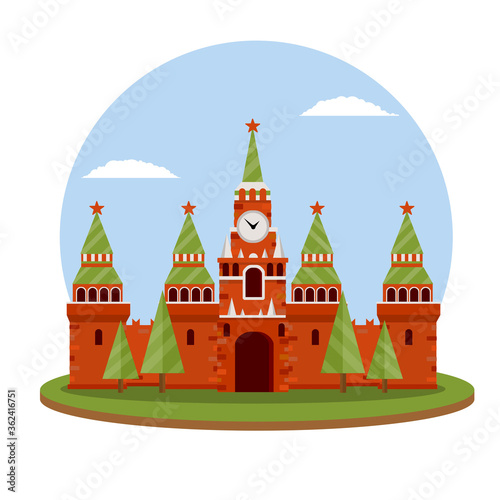 Moscow kremlin. Tourist destination for tour to capital. Fortress with tower and wall. Tourist attraction. Cartoon flat illustration. Summer season. Residence of Russian. President on red square
