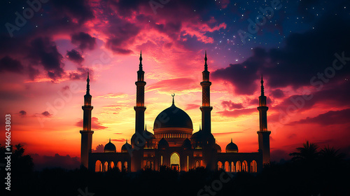 Mosque in night, Tall towers with decorative boarders with a colored background, Silhouette of a mosques