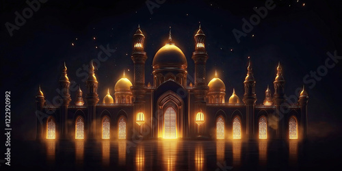 Mosque on a dark background, with space for copy text. Advertising banner for the holy holiday of Ramadan