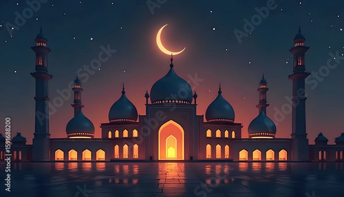 Mosque Silhouette Crescent Moon Night: A striking silhouette of a mosque with domes and minarets against a night sky with a crescent moon.