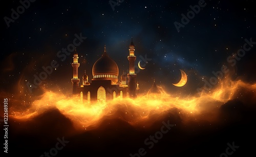 Mosque Silhouette with Crescent Moon Above Glowing Clouds and Sky Background