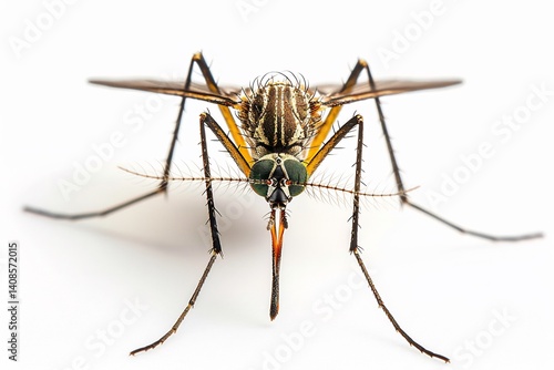Mosquito flying long slender legs dangling transparent wings vibrating detailed body structure isolated on a white background