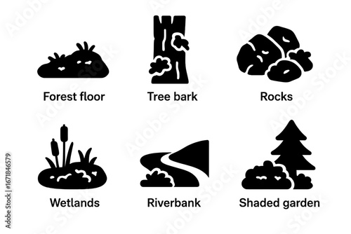Moss habitats icons set, solid filled vector illustrations of moss environments including forest floor, tree bark, rocks, wetlands, riverbank, shaded garden, nature and ecology symbols