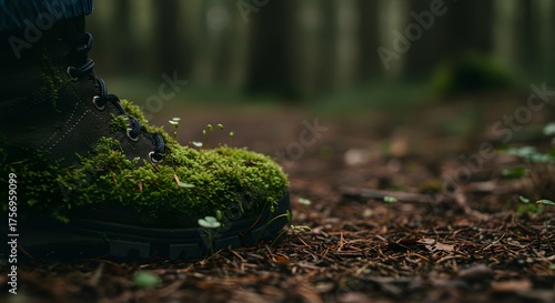Moss-covered Hiking Boot in Forest Trail Natural Outdoor Scene