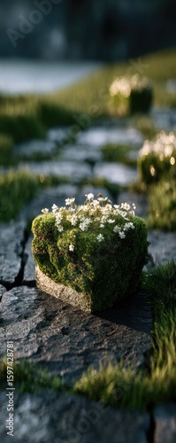 Mossy stone cubes with tiny white flowers