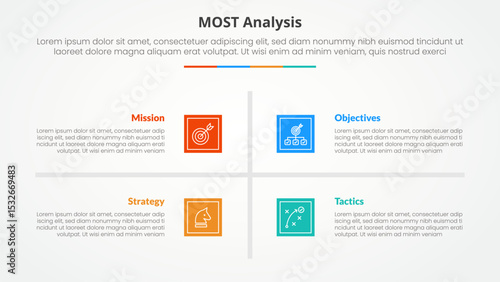 MOST analysis infographic concept for slide presentation with square base and cross line center with 4 point list with flat style