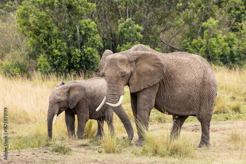 Mother and baby African elephants in the grasslands of the Masai Mara, Kenya.