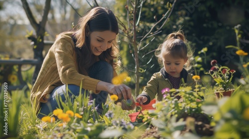 Mother and child gardening together, warm sunlight, suitable for family, nature, and growth themes.