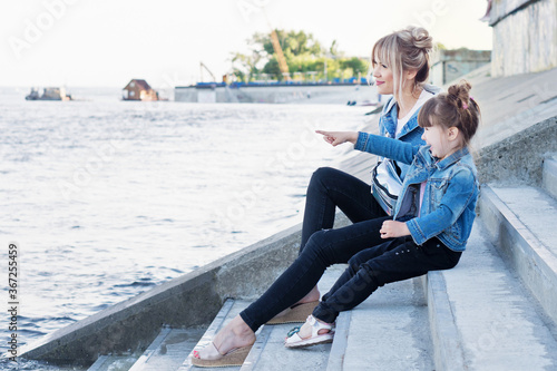 Mother and child walking on sea promenade street. Travel and holiday. Family time together. Modern Denim look. Lifestyle portrait of mom and daughter