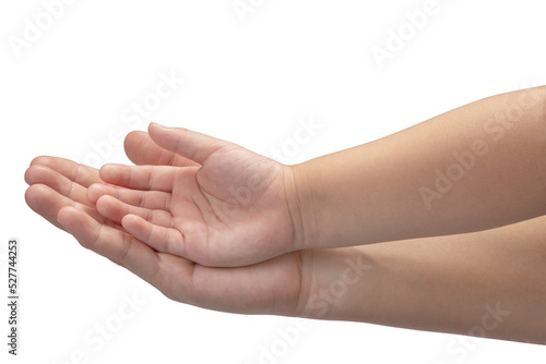 Mother and Child’s holding hands to receive something on white background, Mother and Kid hand on white background PNG file.