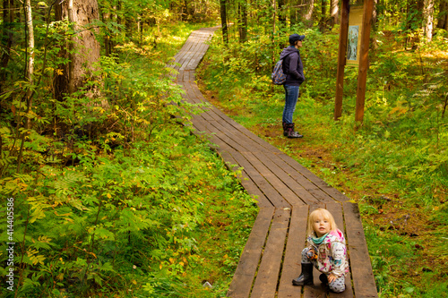 Mother and daughter are traveling. Mother and daughter are walking along the path of the nature reserve in the forest.