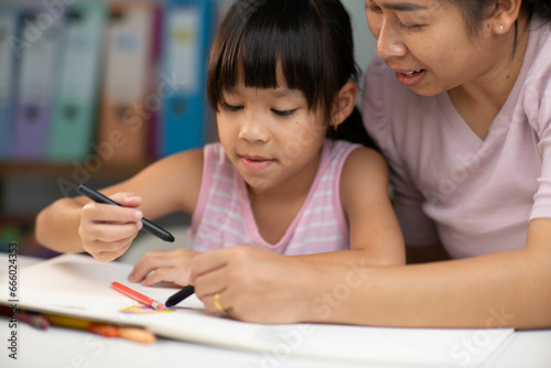 Mother and daughter drawing together with crayons. Adult woman helps girl study or draw together at home in living room. Happy family.