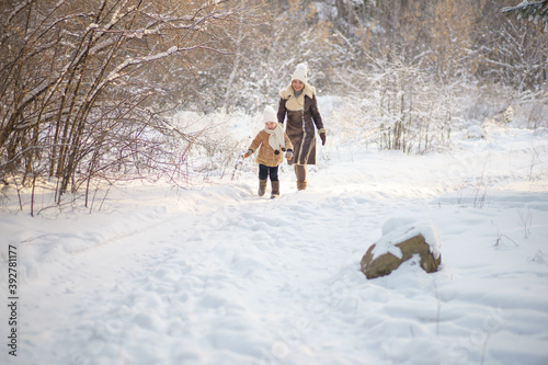 mother and daughter in brown fur coats walk through the winter forest. lots of snow around.