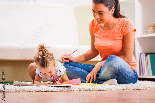 Mother and daughter in their home. Little girl is learning to draw.